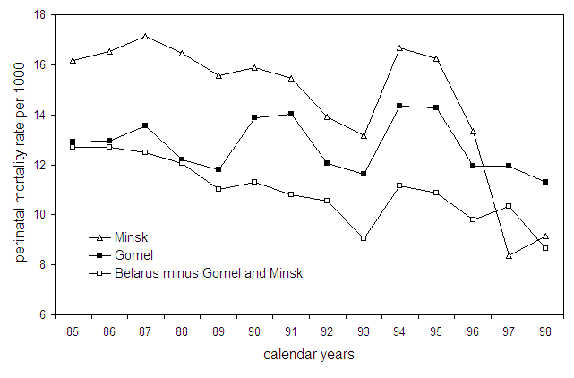 Eine Trendanalyse ist aus den folgenden Gründen problematisch. Erstens gab es eine Änderung der Definition der Totgeburten innerhalb des Untersuchungszeitraum. Zweitens könnte auch der Zusammenbruch der Sowjetunion 1991 einen zusätzlichen Einfluss auf den Verlauf der Daten gehabt haben. Um einen möglichen Strahleneffekt zu finden, ist es deshalb aussichtsreicher, das Verhältnis der Perinatalsterblichkeit im Studiengebiet (Gomel) zu der Sterblichkeit im Vergleichsgebiet (Rest von Belarus ohne die Hauptstadt Minsk) zu untersuchen.